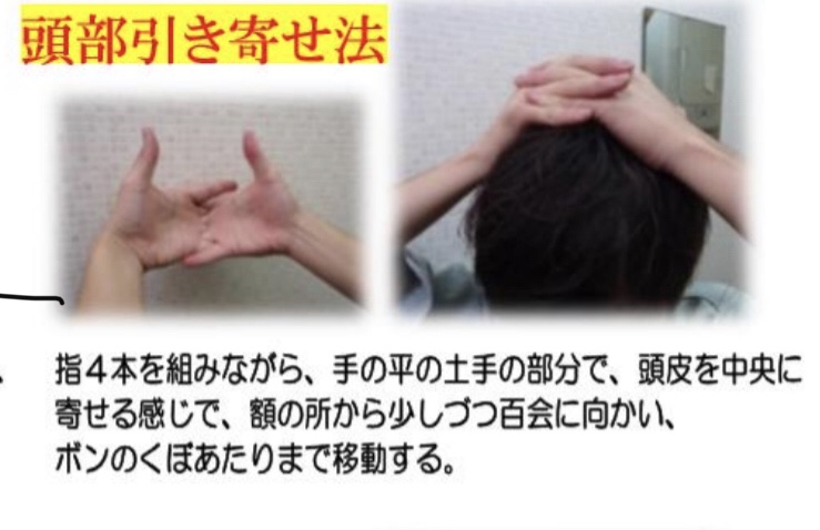 2、次に「頭部引き寄せ法」。指4本を組みながら、手の平の土手の部分で頭頂部を挟み込み、頭皮を中央に引き寄せる感じでぐっと引き上げます。その後手の大きさ分を後ろにズレながら、首の付け根上まで移動します。
