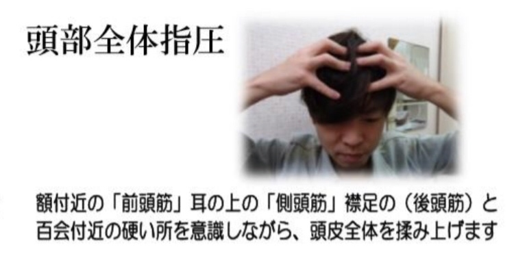 4、最後に「頭部全体指圧」。額付近んお「前頭筋」と耳上の「側頭筋」、襟足の「後頭筋」と百会付近の硬い箇所を意識しながら、頭皮全体を揉み上げます。