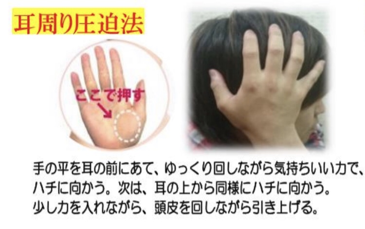 1、まずは「耳周り圧迫法」です。やり方はいたって簡単で、手の平を耳の前に当て、ゆっくり回しながら気持ちのいい程度の力で頭のハチ(横と頭頂部の境目部分)に向かって進みます。次に、耳の上から同様にハチ部分に向かって進みます。ポイントは少し力を入れながら頭皮を回しながら引き上げること。