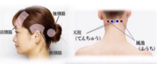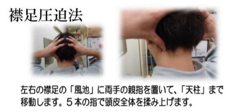 3、「襟足圧迫法」。左右の襟足の「風池」に両手の親指を置いて、「天柱」まで移動します。5本の指で頭皮全体を揉み上げます。(ツボの場所は1枚目の写真参照)