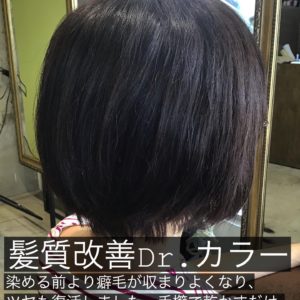 Dr.カラーはカラー剤の中に酢酸塩とゆう成分を入れることでカラー後のシャンプー時にアルカリ成分を髪の内部から完全に除去します。
