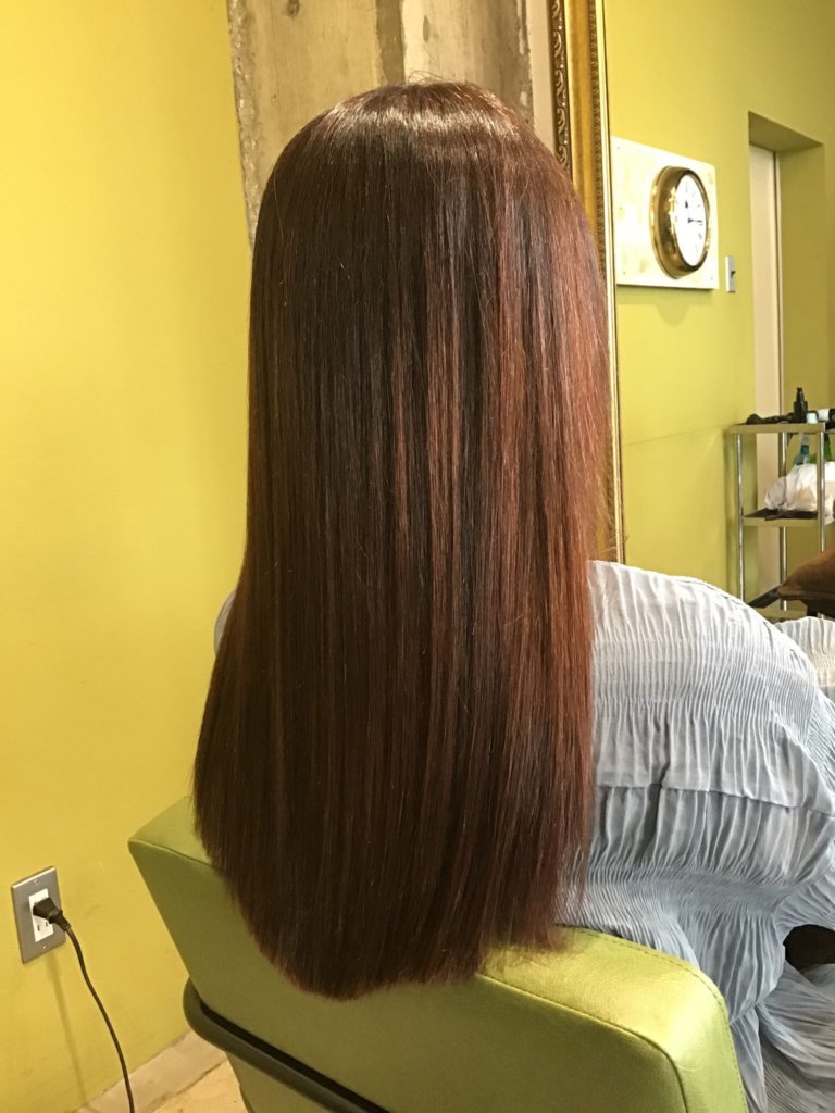 今回のお客様は「シルキーエステ」と「Dr.カラー」を同日に施術し、ヘアカラーの色味をレッド系に仕上げています。