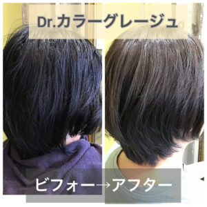注目していただきたいのが、「ビフォー」の写真。2ヶ月経って褪色はしていますがツヤ感が損なわれていないのがお分かりでしょうか?これは毎回トリートメントでケアをしていることと、Dr.カラーの特徴で染めた後も髪内部に残留しないのでダメージの進行を止められるおかげです。