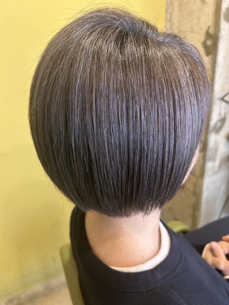 落ち着いたグレーやブルーのニュアンスを含む色味で、白髪とのコントラストを和らげてくれるんです。