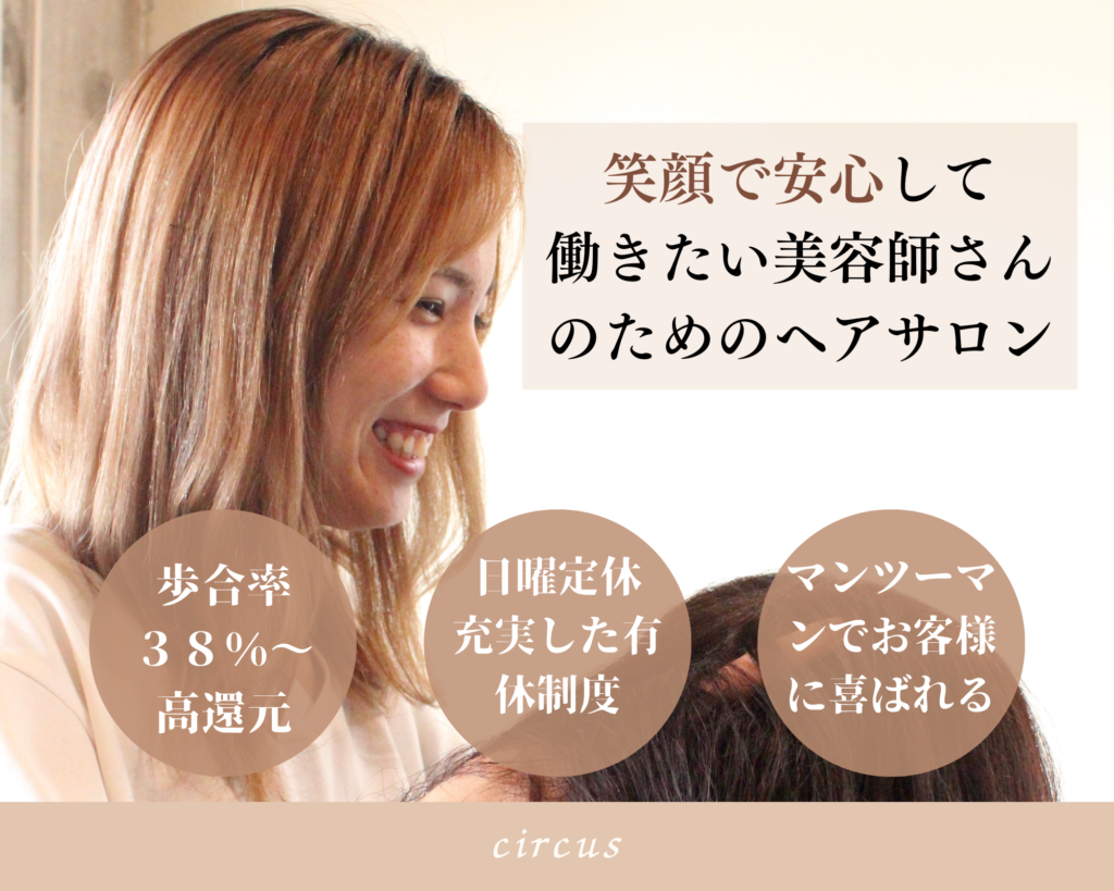 circusは「仕事もプライベートも大事にしたい」「自分らしく美容師を楽しみたい」「家族と時間を共有したい」そんな美容師さんを応援する美容室です。スタイリストとして、アシスタントとして仕事も頑張りながら自分の生活も大切にできる職場です。
